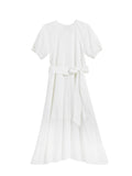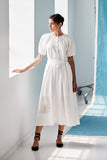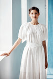 A full button-up, mid-length dress, its puffed short sleeves add a hint of romance. Paired with a coordinating sash for an hourglass silhouette. Cut from the finest sustainable fabrics imported from Italy. Made in New York.